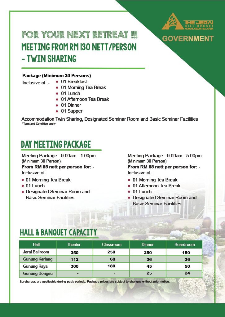 Accomodation Twin Sharing, Designated Seminar Room and Basic Seminar Facilities (Minimum 30 pax) *Term and Condition Apply