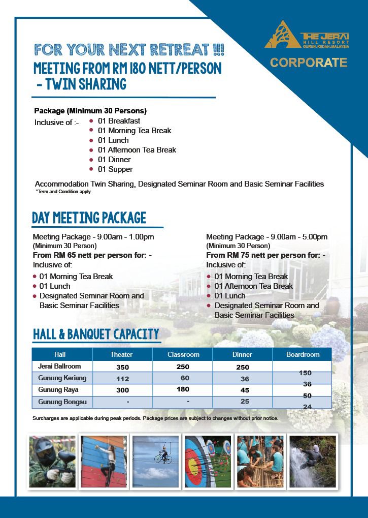 Package (Minimum 30 Pax) Inclusive of : 01 Breakfast 01 Morning Tea Break 01 Lunch 01 Afternoon Tea Break 01 Dinner 01 Supper